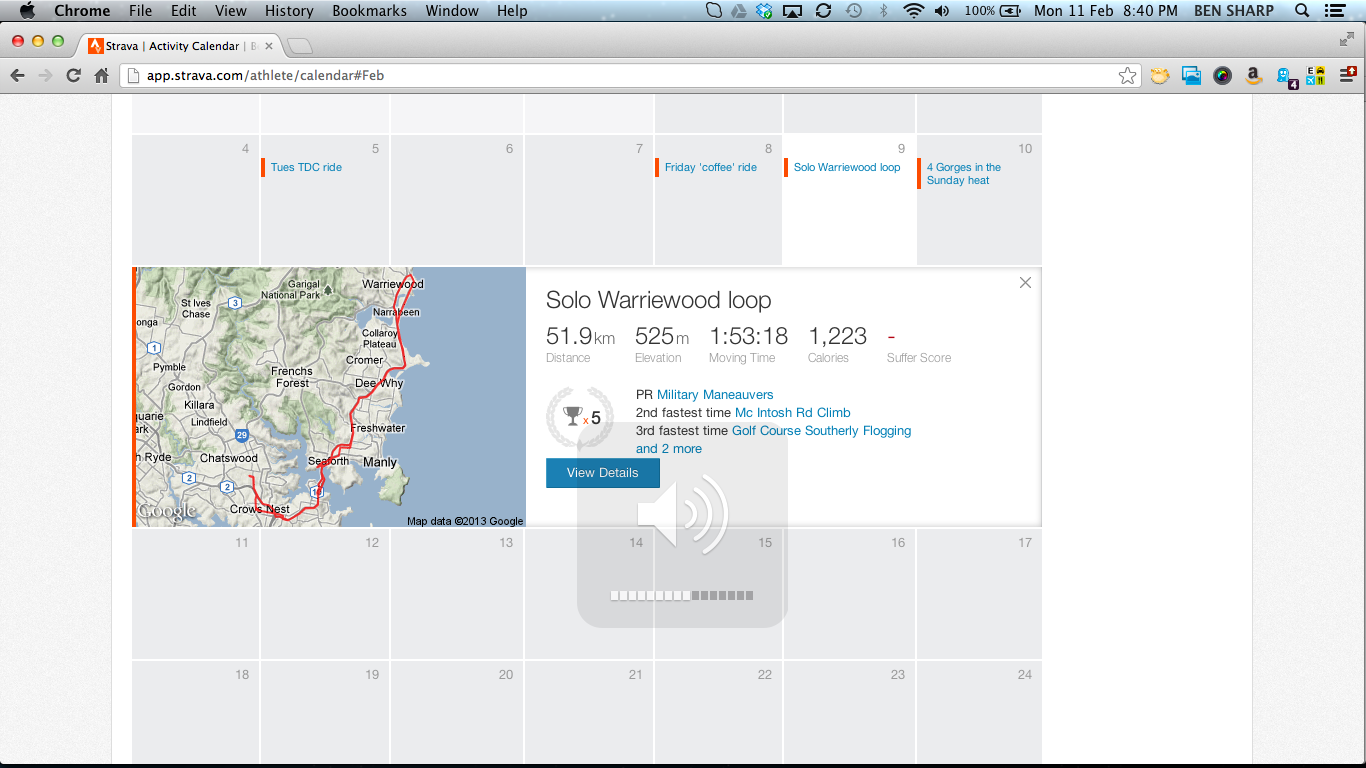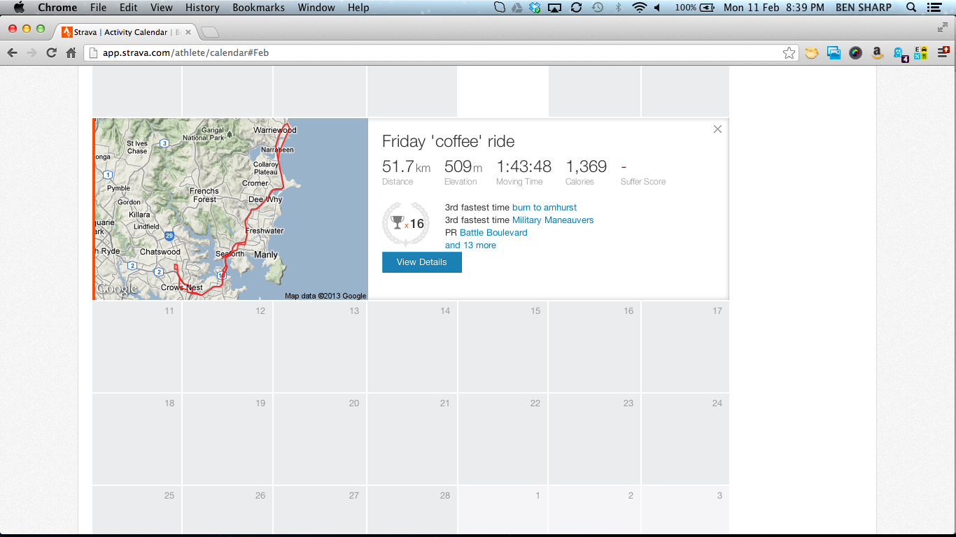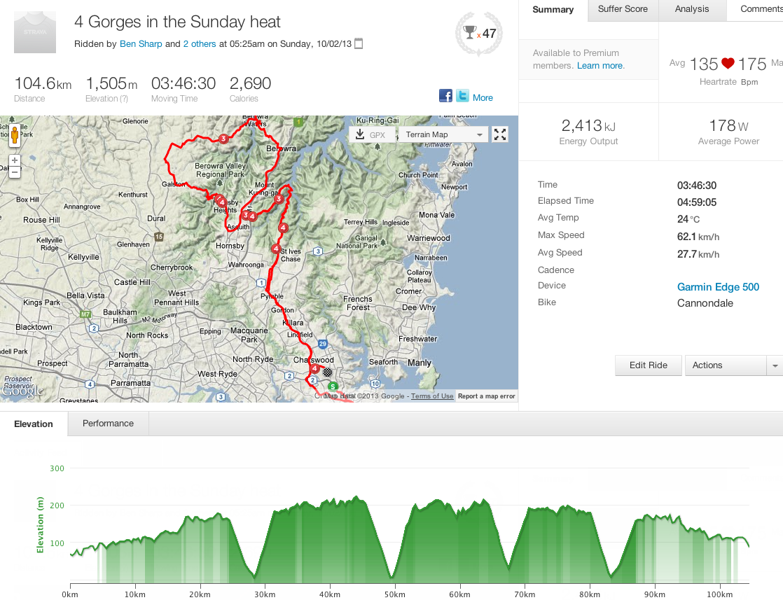 Saturday, I needed to be home early (moving house stuff), so did the Warriewood loop solo. Saw the crew on their way north when I was heading home at around Manly. Interesting fact about the 2 rides I did Friday/Saturday – there was only about a 1km different in average speed (slower) going solo than in the pack.
