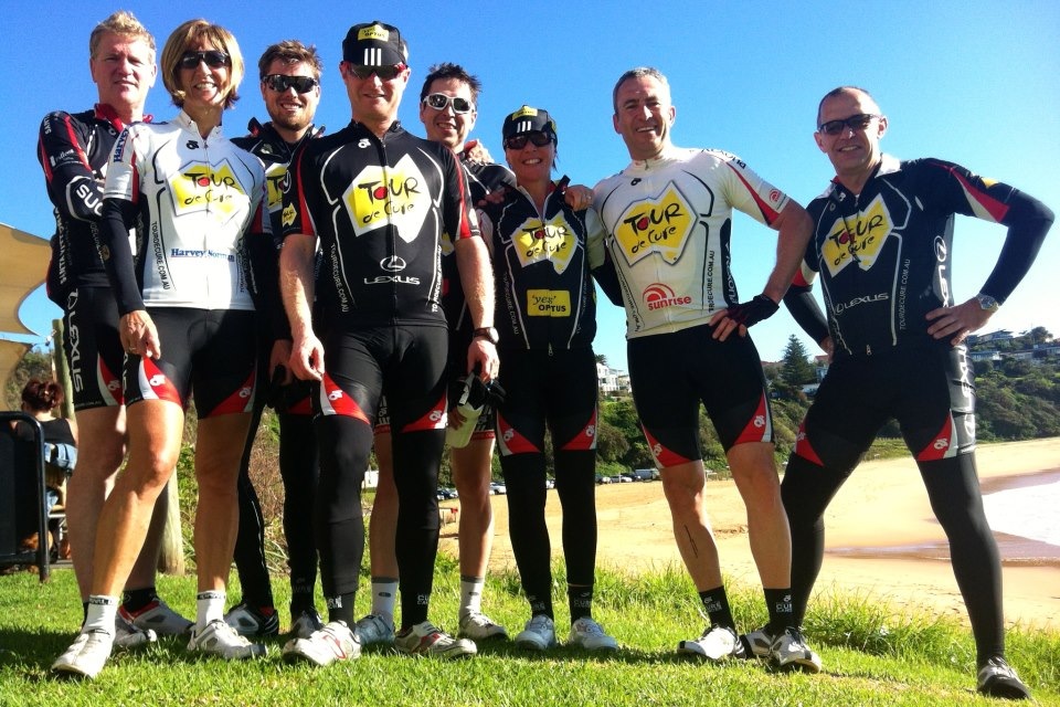 Final training ride on Sunday was great. Weather was amazing (as you can see from the photo), which was a massive contrast to the monsoonal storms we had on Saturday. Had a good group of us out for a easy roll up to Palmy and then an extended breakkie at Warriewood. And got into the swing of Tour with a bunch of photo ops.