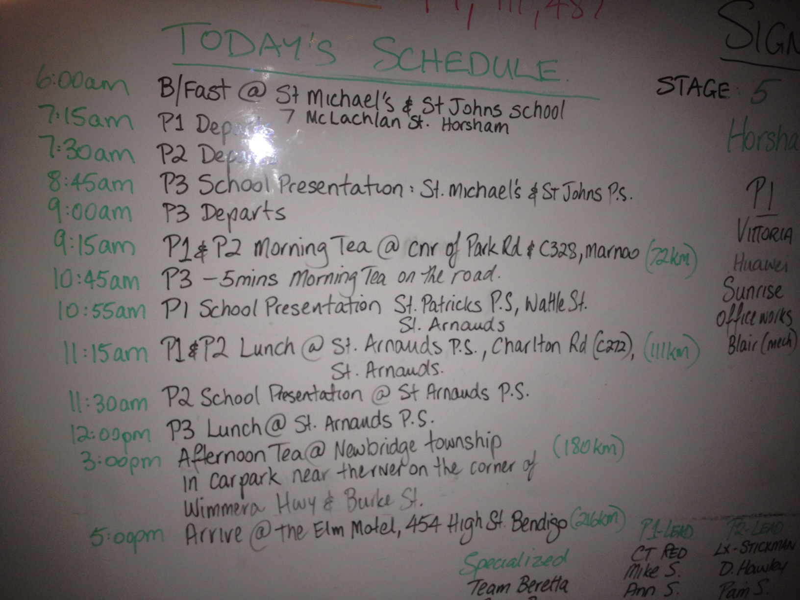 The Whiteboard told us many things – which day we were up to, where the fundraising was up to, what colour kit to wear, who was the stage partner, time for breakfast, peleton departure times, which peloton you were in, your chores, your lead & rear cars as well as who was driving them, distance to morning tea & where, which schools we were visiting, distance to lunch & where, corporate visits & where, distance to afternoon tea & where, massage list, bike mechanic list, time for laundry at the whiteboard, time for dinner & where, as well as any special arrangements!