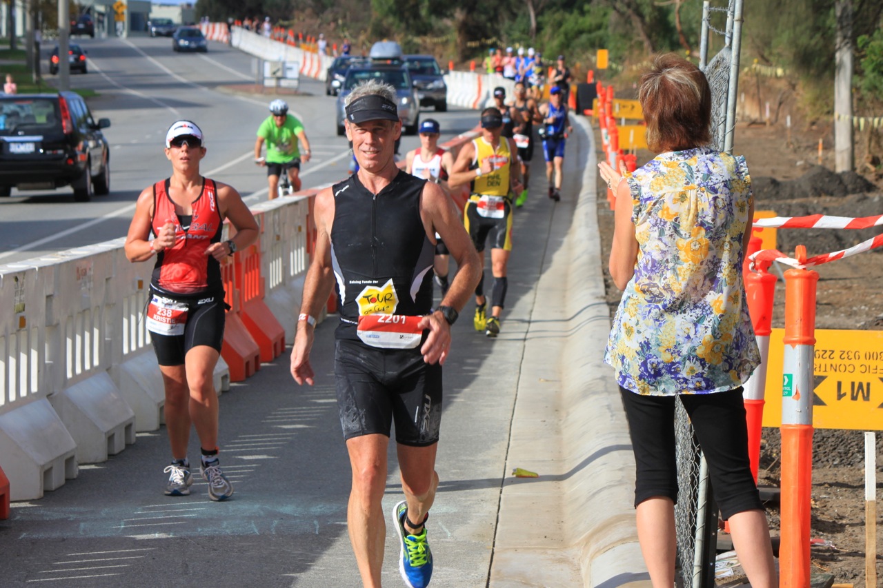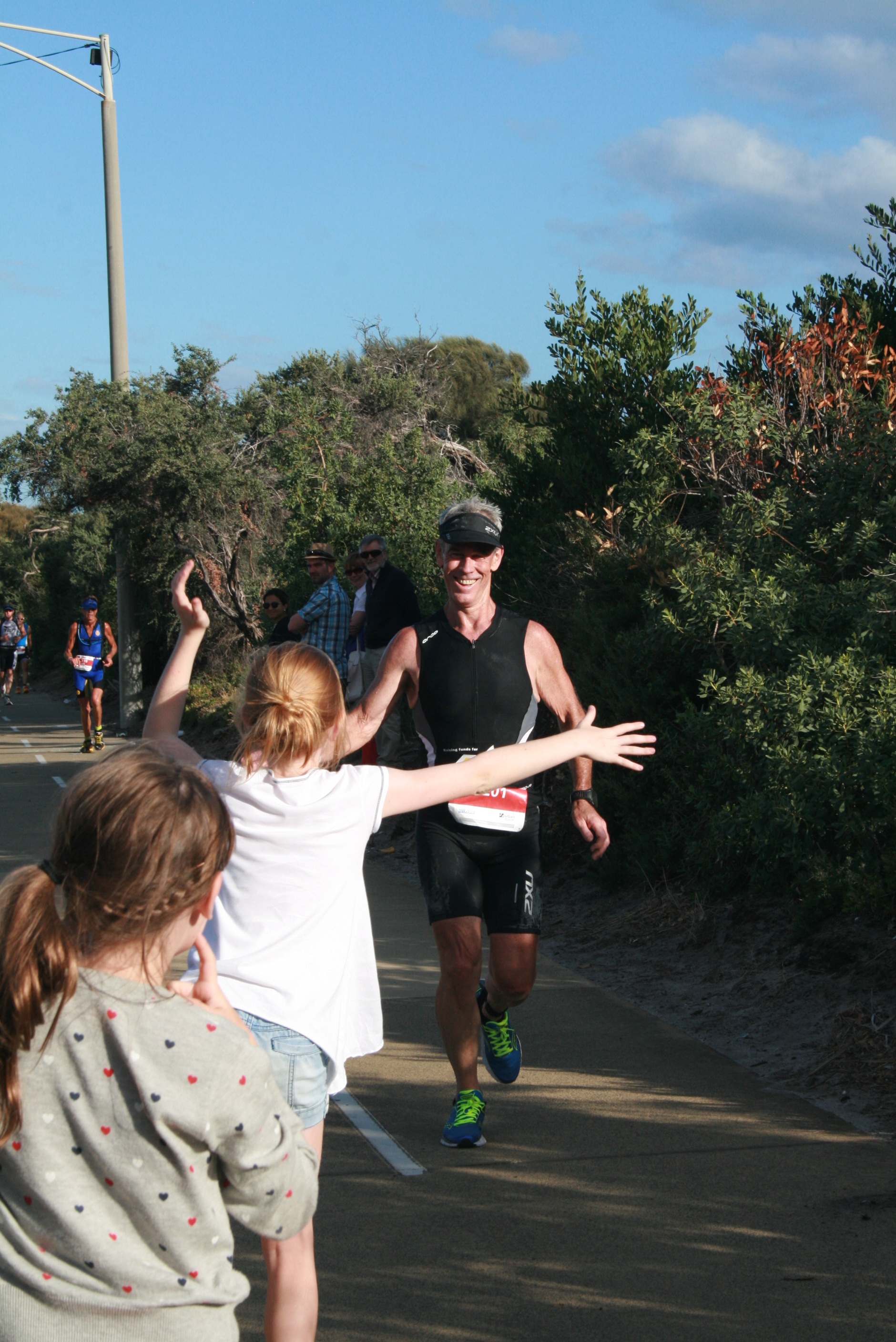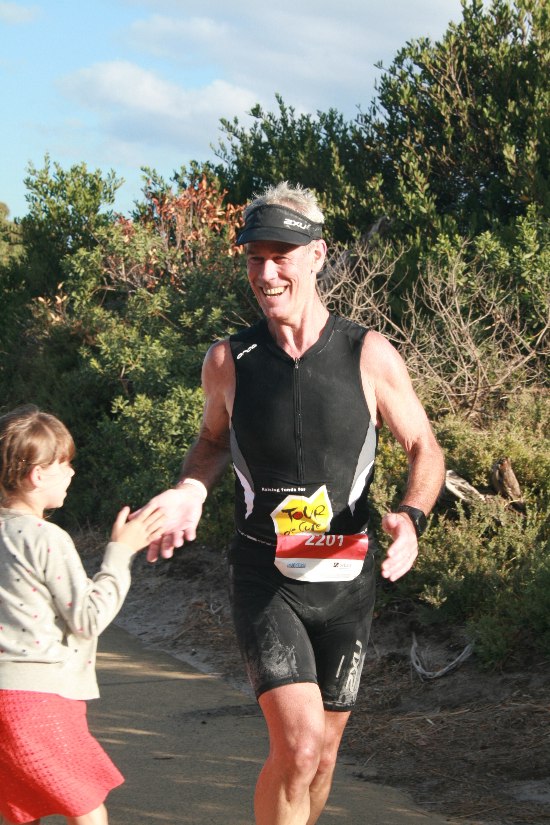 My final lap was buoyed by Lorna and the Girls being on course with a “Go Daddy poster” which included much cheering, it helped me push on a little faster but I later slowed down a little in trying to keep some energy for the impending run. The bike and transition end in Frankston was greeted with Geoff and Callum from Tour de Cure,  who witnessed my jelly legs and concern at the thought of starting to run 42.2 km’s.