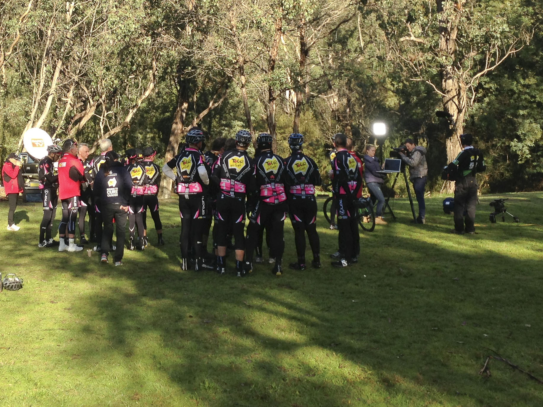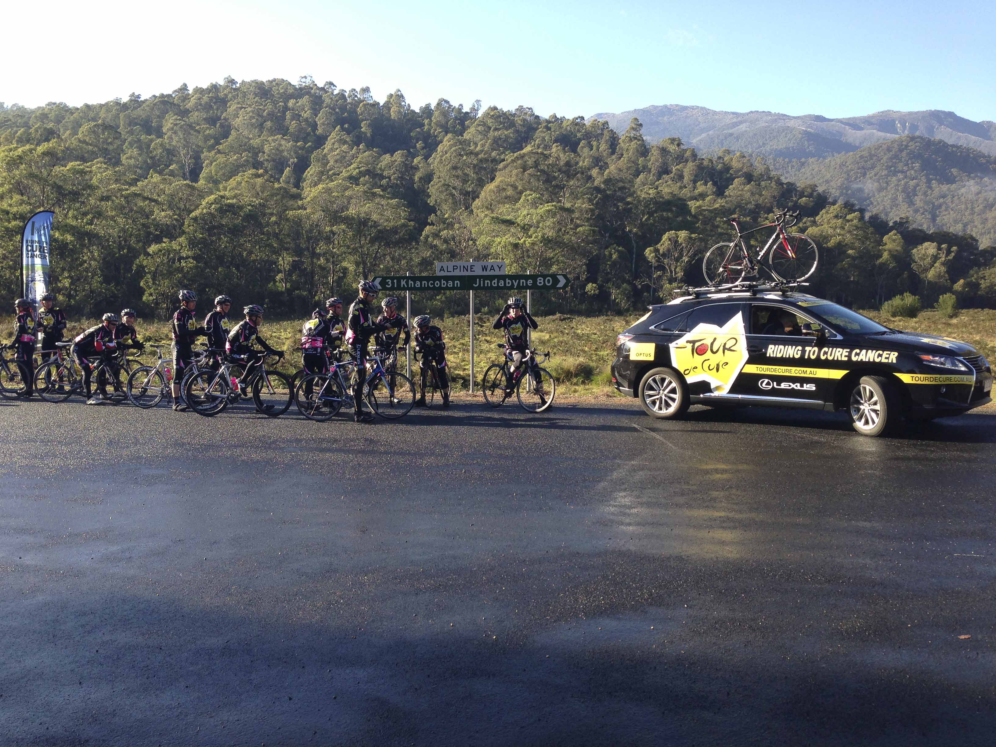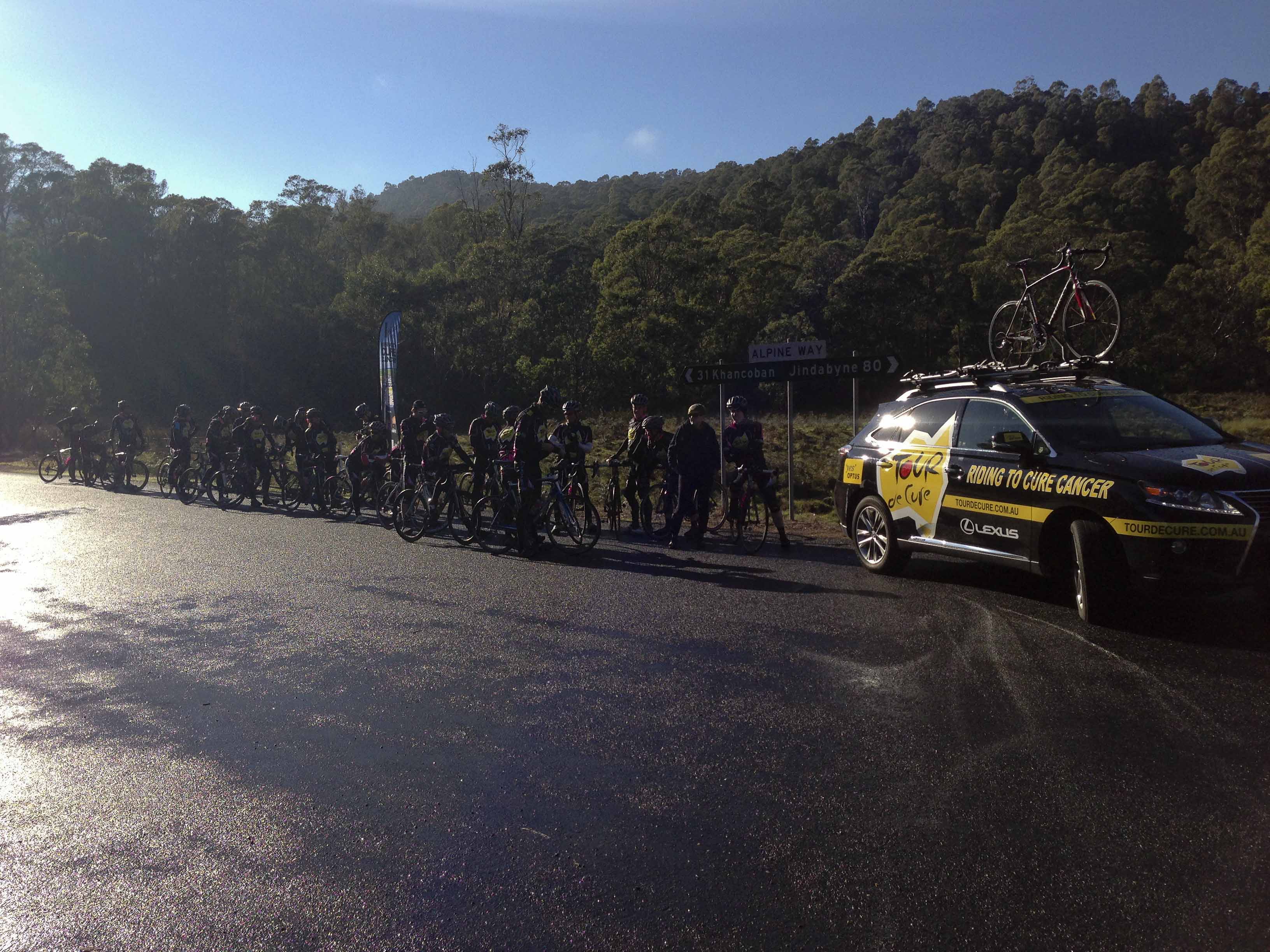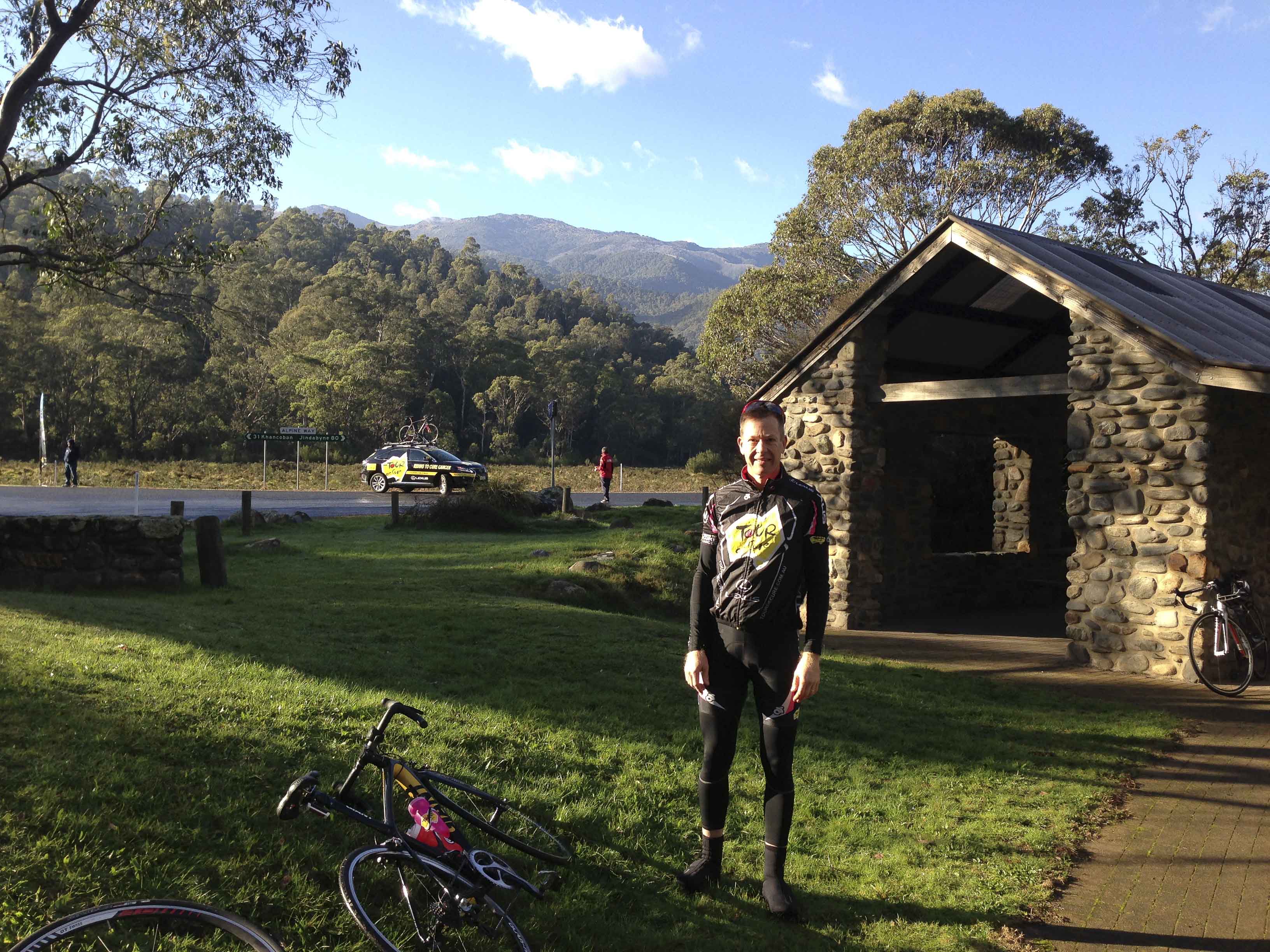 The day started at 4.50 wake-up in Khancoban and breakfast in the local Diner. Peleton rollout at 6.30, with a 9 km climb, and about 500m vertical, to the sunrise filming at 8.30 am. It had rained overnight and the roads were damp – about 5 degrees, but not much wind at all. The filming was done at Geehi Dam, and we were in a gorgeous little clearing with a running creek behind. Alpine huts and the whole Snowy Mountains theme!